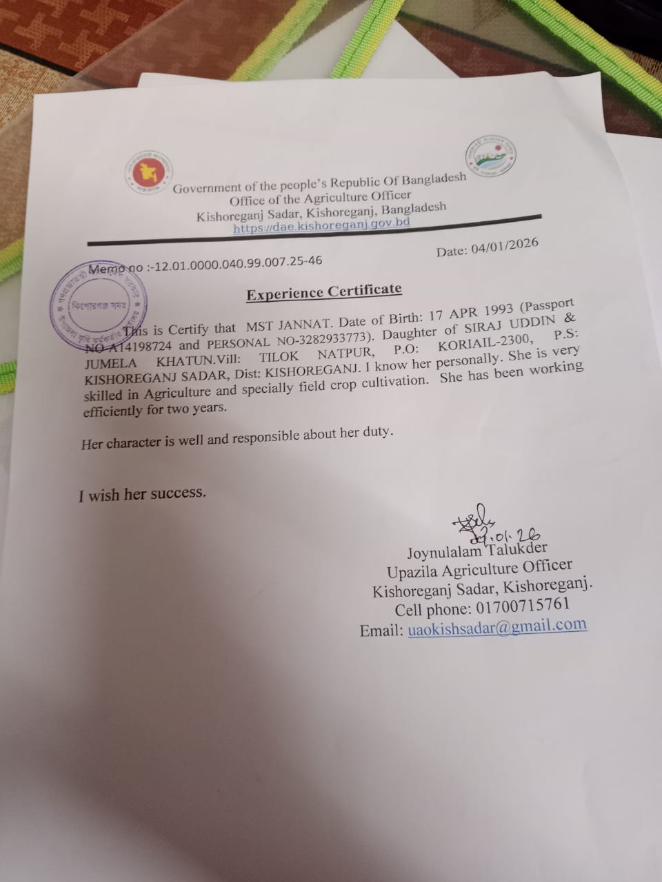 | ১০ | কৃষি অভিজ্ঞতার সনদ, স্মারক:76 | | | ০৬-০১-২০২৬ | দেখুন |